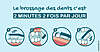 Le brossage des dents c’est 2 minutes, 2 fois par jour ! 1- Brosser la face supérieure des dents par un mouvement d’avant en arrière. 2- Incliner la brosse à 45° afin d’éliminer le maximum de plaque dentaire. 3- Effectuer un mouvement de rouleau de la gencive vers la dent pour bien nettoyer les faces internes et externes des dents. 4- Dents de devant : placer la brosse verticalement en allant toujours de la gencive vers la dent.